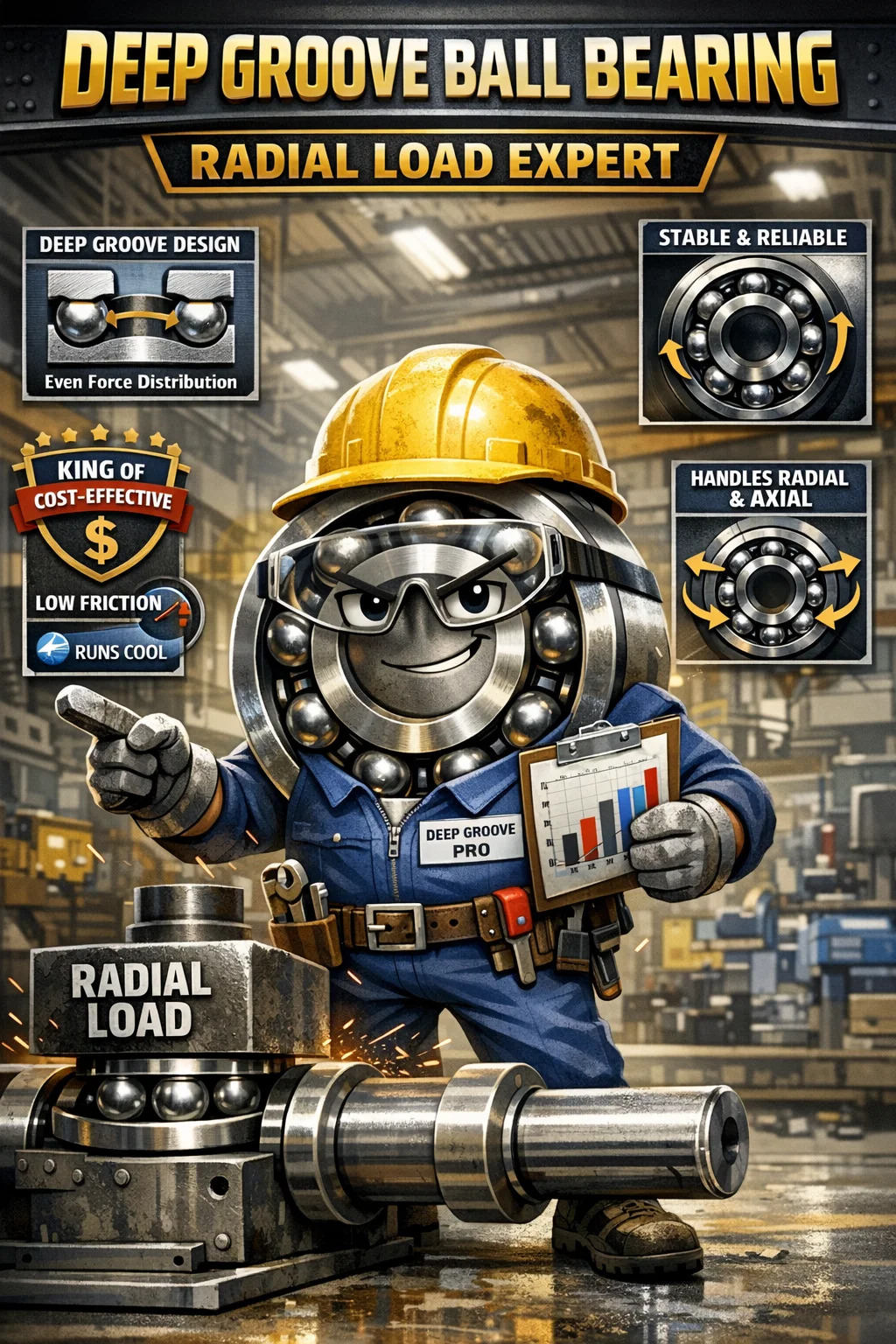 Obwohl seine Hauptaufgabe darin besteht, radialen Kräften standzuhalten, kann es aufgrund der Tiefe der „tiefen Nut“ auch eine gewisse axiale Kraft aufnehmen (Kraft, die die Welle von einer Seite zur anderen drückt). Diese Fähigkeit, sowohl radiale als auch axiale Belastungen zu bewältigen, macht es heute zum am häufigsten verwendeten Lager der Welt.